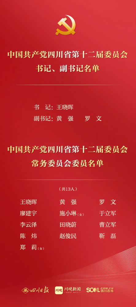 5月30日下午,中国共产党四川省第十二届委员会第一次全体会议在成都举行。会议选举产生了中国共产党四川省第十二届委员会常务委员会委员和书记、副书记。 中国共产党四川省第十二届委员会 书记、副书记名单 书 记:王晓晖 副书记:黄 强 罗 文 中国共产党四川省第十二届委员会 常务委员会委员名单 (共13人) 王晓晖、黄强、罗文、廖建宇、施小琳(女)、于立军、李云泽、田晓蔚、曹立军、陈炜、赵俊民、靳磊、郑莉(女) 来源 | 川观新闻 原文链接:https://new.qq.com/omn/20220530/20220530A082AH00.html |