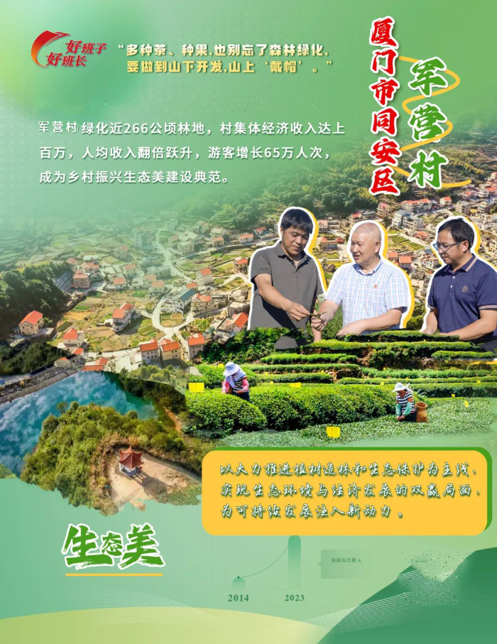 厦门同安军营村的九龙溪碧水微澜,许多游客行走在鹅卵石的溪边小道上,蓝天白云倒映在清澈的水面上,凉风习习,怡然自乐。一排经营摊位从桥头沿着宽阔的马路边沿延伸到村委会门口,整齐有序,几辆旅游大巴车停下,游客成群结队,卖土特产的阿婆细心介绍着产品,脸上堆满笑容…… 昔日的脏乱差披上了“绿衣”,生态发展在这里得到了印证。军营村党总支书记高泉伟表示,“持续发展绿色生态,环境好了,景观美了,连空气都可以卖钱,这些都让军营村成为闻名遐迩的‘富美新农村’。” 寻森林绿化路 “生态美”再续华章 20世纪80年代,当地村民为发展茶产业砍伐山林,生态破坏严重。之后,军营村在“山上戴帽,山下开发”的绿色发展思路下“华丽转身”,从穷乡变为了富壤。 多年来,军营村“两委”坚持守护绿水青山,一任接着一任干,通过“党员带头做示范,群众参与同配合”,植树造林266公顷,涵盖樱花、铁冬青、台湾栾树、红锥树等十余种树苗。 2022年,军营村成立全国首个农业碳汇服务驿站,在当年就开发了茶园碳汇面积381公顷,新增碳汇收入14854元,而现有的生态公益林也在持续推进开发碳交易产品。不仅如此,全村40.5公顷天然林、268公顷公益林,村集体每年还可领取23.76万元的森林生态补偿金。 军营村“两委”同时建立了自治管理长效机制,将生态保护的观念纳入村规民约,从制度上守护住这一片青山绿水。如今,军营村人均月收入达6000多元。军营村民通过植树造林,换回了绿水青山,高山变成了“靠山”。 做好“水的文章” 留住“高山乡愁” 要青山也要绿水。军营村通过旱厕填埋、道路硬化、裸房整治等措施改善了村容村貌。其中,水环境治理尤为重要,不仅关乎村民健康,也提升了居住环境。为此,军营村下大力气整治九龙溪,并设立“党员护溪岗”和“志愿护溪岗”。 “不仅河道垃圾被全面清理,我们还在村庄周边种植树木花草,打造绿色生态屏障。”高泉伟表示,2009年以来,军营村林分修复234公顷,景观造林31公顷。九龙溪经3次治理后清澈见底,古桥古树韵味长存。田间变公园,步道成绿道,白石板替黄土,田埂道铺鹅卵石,形成乡愁记忆景观溪。 一系列环境整治措施的实施,让军营村的环境面貌发生了翻天覆地的变化。优美的环境吸引了更多游客前来观光旅游,也为村民提供了更加宜居宜业的生活环境。 2017年11月,军营村获评第五届全国文明村镇。 高山上办党校 丰富精神 带来效益 2016年4月7日,厦门市委党校高山教学点和同安区委党校高山教学点在军营村、白交祠村揭牌成立。 军营村持续扩大高山党校品牌影响力,2016年高山党校建校以来,举办培训班600余班次。2021年军营村入选全国“建党百年红色旅游百条精品线路”,高山党校初心使命馆成为省、市、区三级党校现场教学基地;创新“党校负责教学、国企运营保障、村民入股参与”模式,辐射带动游客量超100万人次。 民宿、农家乐、土特产售卖,让军营村的村民享受到了红利。“如今很多外出打工的年轻人都回村创业了,大家的收入都得到了提高。”高泉伟表示。 念好“生态茶园”致富经 旅游产业蓬勃发展 厚植生态底色,突出发展特色,彰显乡村本色。军营村“两委”引领村民引进先进种植技术和管理经验,对老茶园进行生态化改造,减少化学农药使用,保护生态环境;同时,与科研机构和企业合作,研发高品质茶叶产品,提升附加值和市场竞争力。 随着生态茶园建设的深入推进,军营村的茶叶品质显著提高,品牌影响力不断扩大,越来越多的游客和茶商纷至沓来,体验茶园风光,品尝军营茶香。 截至目前,军营村对433公顷的老茶园进行了生态化改造,生态茶园不仅成为军营村的金字招牌,更带动了村民增收致富。 在“生态美”的带动下,乡村旅游产业蓬勃发展,军营村成为厦门周边备受青睐的乡村旅游目的地。 军营村先后获福建省“金牌旅游村”“全国乡村旅游重点村”等称号。近5年来,军营村全年平均游客量达到65万人次,入住年平均游客量达6.8万人次。(厦门市委宣传部 福建支部生活杂志社)http://www.fj.xinhuanet.com/20240920/3273e36265a840ea8ab6653c4aea0508/c.html |