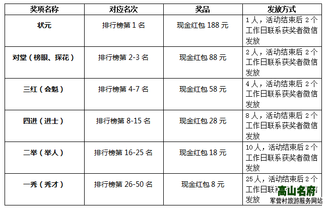 参与微信博饼活动,领取现金红包了 一年一度的中秋节又到啦!为了感谢大家一直以来对同安军营村的支持,对高山名府的支持,值此佳节,旅游开发有限公司通过微信公众号举办了“2019首届中秋博饼嘉年华”,每个人都可以参与,大家一起体验中秋节日乐趣。 怎样参加博饼 1、首先需关微信公众号,扫下方二维码快速关注 2、在微信公众号底部菜单中,点击“中秋博饼”,进入博饼页面 3、首次参加博饼,需要填写您的名称、手机号、地址、微信号,以便您兑换现金红包 博饼奖金设置 博饼说明 “高山名府2019中秋博饼嘉年华”详细说明如下,请大家务必仔细阅读: 1、活动时间:2019年9月2日-2019年9月12日 2、兑奖时间:2019年9月13日-2019年9月15日 3、凡是参与本次博饼活动的,每个人每天最多可以博饼10次,且可以邀请朋友助力博饼,每邀请一个朋友他可以帮你博饼5次,没有限制邀请几个朋友助力 4、本次博饼活动根据总积分排行,取前50个名额发放现金红包 5、本次博饼活动奖金统一通过微信红包发放,请大家加电话:18965176946(微信同号)为微信好友,扫下发二维码快速添加 6、本次博饼活动规则如下: 7、本次博饼活动最终解释权归高山名府所有 博饼小窍门:多多邀请亲朋好友助力博饼,您将获得更多的积分。 关于我们 高山名府微信公众号是厦门高山名府旅游开发有限公司官方微信服务号,主要为广大游客提供同安军营村旅游服务、本地特产销售,集旅游包车、乡村民宿、农家乐饭店、军营村旅游团接待等服务,是游客前往厦门军营村旅游的小帮手。 |