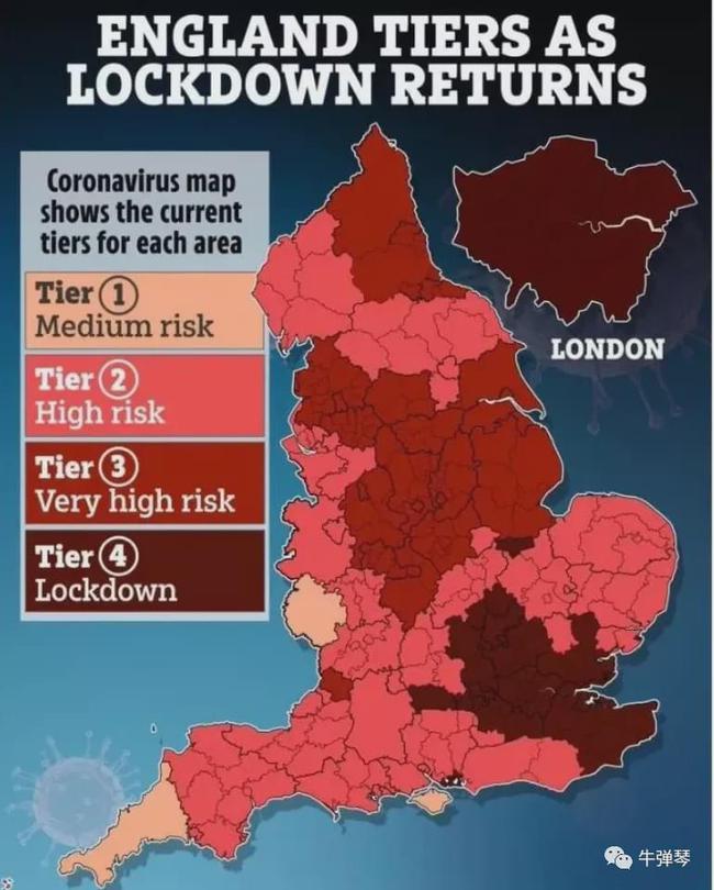 两个最糟糕消息袭来,在这个凛冬时刻。 第一个坏消息,伦敦封城了。 伦敦总人口约900万,但这一次封的还不仅仅只有伦敦,包括伦敦所在的英国东南部地区,涉及人口1600万。 英国全国总人口约6600万,也就是说,四个英国人中,就有一个被封锁中。 看英国人的地图,第四类地区,就是被封城区域,红得格外刺眼。 因为在这个地区,新冠病毒正出现变异。这种代号VUI-202012/01的变异,据说比原始毒株传播力高出70%。 更让人倒吸一口凉气的是,仅仅在上个月,伦敦的确诊者中,只有28%是感染了这种病毒;但现在,这个数字已经提高了62%。 英国政府首席科学顾问瓦兰斯警告:“这种病毒肆虐,传播更快,将不可避免地导致医院收治的病人激增。” 英国政府不得不紧急行动起来,哪怕是圣诞节,今年也没有办法了。 原先所有的圣诞安排,全部取消,新规定: 如非必要,禁止旅行;取消原定的圣诞社交气泡;