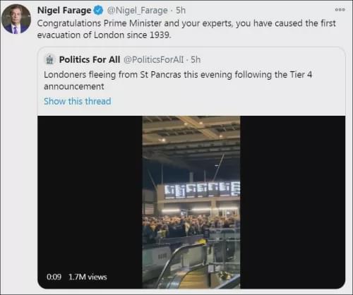 如果没说错的话,这应该是当今世界正在执行的最大规模封城了。 这还是第一个坏消息,第二个坏消息,更让人倒吸一口凉气。 看一下最上面的图片,你应该就能清楚地感受到。 封锁令一下,伦敦民众大逃亡! 伦敦各大火车站人头攒动——人们抢在午夜之前,挤上最后一班离开伦敦的火车。 你可以想见火车站和火车上的拥挤程度,更糟糕的是,很多人还都没戴口罩。 中国的病例非常非常少,但你能想象北京南站、上海虹桥站里,旅客们不戴口罩吗? 不能不说,这个世界,我们的素质已经限制了我们的想象力。反正,我们想都不能想的事情,却在伦敦经常性发生,哪怕现在伦敦正处于封城的紧急状态下。 不是每个人都有机会逃离伦敦,选择呆在伦敦的人发现,接下来的封城令,意味着很多商铺店家都会关门。 于是,很多人纷纷赶在午夜之前,购买生活的各种必需品,也采购圣诞礼物。 很多商场超市,触目可见是拥挤的人群,人们排队购物,很多人也没有戴口罩。 封城的目的,是为了避免病毒扩散;但伦敦封城的结果,却是大量人口的聚集,甚至是大逃离。 那对来不及采取行动的其他地区、其他国家,意味着什么? 你应该懂的。 英国“脱欧党”领袖奈杰尔·法拉奇(Nigel·Farage)在社交媒体上反讽道:“恭喜首相和您的智囊团,你们造成了1939年以来的首次‘伦敦大撤离’。” 上一次还是80年前的第二次世界大战,这一次比上一次规模更大。 所以说,一个超大城市的封城,不是说封就能封的,既需要政治勇气,更需要智慧和谋略,没有高效的组织指挥,没有民众的积极配合,封城往往是另一种灾难的开始。 再说一遍,两个最糟糕消息,第一个超级病毒变种,第二个伦敦大逃离。 全世界也看得肝儿颤,各国紧急行动起来。 看了一下,与英国最近的欧洲国家,已经从星期日零时起,采取紧急行动,几乎掐断了与英国的所有交通。 法国,从周日凌晨起,禁止英国来客48小时。 德国,除货运外,从周日凌晨起,不接受所有英国航班降落。 比利时,航班禁令,同时终止同英国的火车通行。 此外,爱尔兰发布48小时英国航班禁令,荷兰今年余下时间禁飞英国航班,已吃尽苦头的意大利,干脆下令,接下来14天,任何去过英国的人,禁止进入意大利。 欧洲之外,以色列也发布紧急命令,禁止从英国、丹麦和南非起飞的航班降落,因为这些国家,都发现了病毒的变种。 伊朗也发布了类似禁令。 请注意,很多都是紧急决策,时间太紧了,更细化措施随后会出台。但可以预料,越来越多国家会跟进,毕竟人命关天,任何懈怠放松,那意味着更多生命的代价。 如果您这段时间必须要国外出行,一定关注再关注,小心再小心,当然,能不出去,最好还是别出去了。 因为更糟糕的一点,变种还在扩散中。 看到世卫组织(WHO)卫生紧急项目技术主管玛丽亚·范·科霍夫就说,除了英国外,丹麦、荷兰,以及澳大利亚,都发现了这种变种。 她警告:变种传播的时间越长,再变异的机会就越多,“所以我们现在真的需要尽一切努力防止传播。” 时间非常关键,现在必须争分夺秒。 唉,真不知道该说些什么。 2020年终于要结束了,疫苗也已经研发出来,当很多政治家欣喜宣布“已经看到隧道尽头的亮光”时,新的更可怕的变种在英国出现了。 2020年,我们看到了太多的悲剧,我们以为悲剧即将结束,但我们看到新的悲剧正在发生。 我们今年春节快速经历的噩梦,西方人花了一整年时间慢慢经历,而且新的噩梦又来了。 接下来就是西方的圣诞节,一个最糟糕最难忘的圣诞节。唉,或许我们又要说一遍了:没有一个冬天不会逾越,没有一个春天不会到来! 特别声明:以上内容(如有图片或视频亦包括在内)为自媒体平台“网易号”用户上传并发布,本平台仅提供信息存储服务。 Notice: The content above (including the pictures and videos if any) is uploaded and posted by a user of NetEase Hao, which is a social media platform and only provides information storage services. |