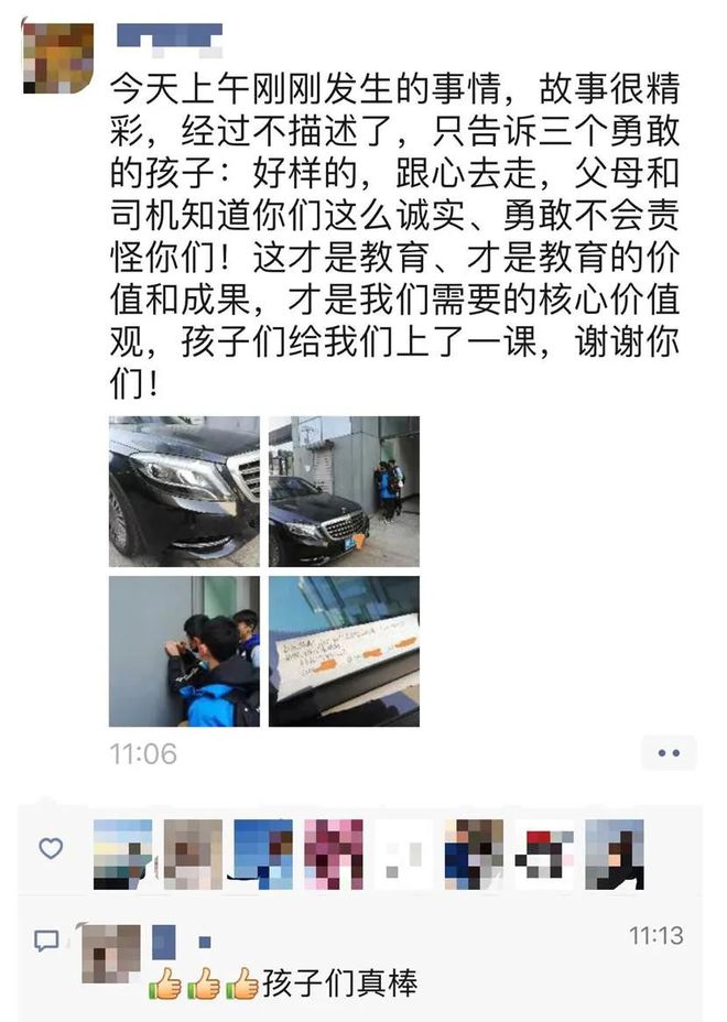 12月20日中午11点多,网友Blindm@n.s发了这样一条朋友圈,引来微信好友点赞: “故事很精彩,经过就不描述了,只告诉三个勇敢的孩子:好样的,跟心去走,父母和司机知道你们这么诚实、勇敢,不会责怪你们!这才是教育的价值和成果,才是我们需要的核心价值观,孩子们给我们上了一课,谢谢你们!” 从网友所发的照片中可以看到,三个男生站在一辆迈巴赫旁边,写了张字条,随后夹在了车子雨刮上头。 这是咋回事? 浙江之声记者了解到,这位网友说的事情发生在20日上午10点多,地点位于宁波市海曙区。 网友所发朋友圈中提到的三名男生,是当地横街镇中心初级中学九年级的陈凯祺、刘庆航和张诚俊。当天上午,三人一起去集士港利时广场附近上培训班。下课后,陈凯祺和张诚俊二人一起骑车去买吃的,不小心剐蹭到了路边一辆迈巴赫。 两人起初略显惊慌,赶紧找来小伙伴刘庆航商量对策。 三人在原地等了一会儿并未等到车主,于是商量一致后,由一人执笔给车主留下了这样一张字条:“叔叔(阿姨)您好,我们在骑车的时候一不小心碰到您的车了,我们非常抱歉。”字条下面,还写了三个家长的电话号码。 这一幕,恰巧被路过的网友Blindm@n.s目睹并用手机记录了下来。在三个孩子还有些不知所措时,这位热心市民上前肯定了他们的行为,让他们先回家,自己则留在原地等到了被剐蹭车辆的车主并向车主解释了事情的原委,“车主当时表现非常通情达理。” 下午,记者联系到了当时骑车的陈凯祺同学的父亲。陈先生表示,孩子回家以后就把这件事告诉了他,“我平时经常告诉他,做错事要勇于承认错误。” 截至发稿,被剐蹭的车辆车主尚未联系三人的家长。 此外,记者注意到,孩子们当时骑的是电瓶车。根据《中华人民共和国道路交通安全法实施条例》第七十二条,驾驶电动自行车必须年满16周岁。为三个孩子点赞的同时,我们也温馨提醒,大家出行时应遵守相关交通法规,把安全放在第一位。 |
