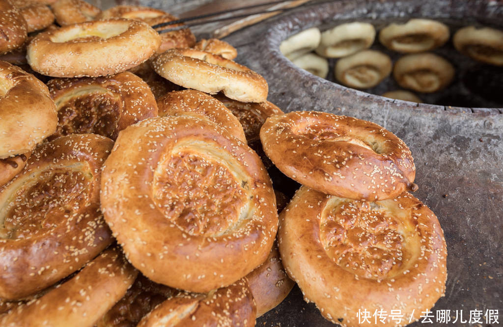 新疆必备啊!作为新疆的主要面食,新疆饭馆都有,其实馕有很多种,有肉馕、芝麻馕、片馕等上百种花样,外焦里嫩,香脆可口,馕可以单独食用,一个就顶饱,它最美味的吃法是干馕配奶茶。好吃到根本停不下来!