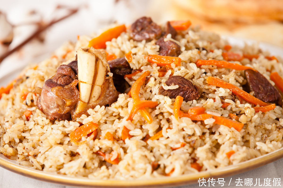 新疆的抓饭有肉抓饭和素抓饭,抓饭讲究的是火候,一般都是当主食。里面一般放有洋葱、胡萝卜条、羊肉块,做抓饭容易,但美味可口、色香味俱全的抓饭还是要来新疆,每到过年过节,当地人都会拿这道菜待客。